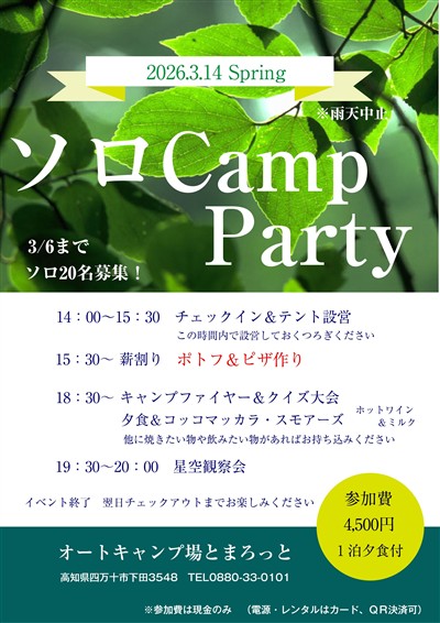 ▲ソロ Camp Party ソロ20名募集!(募集締切は3月6日) 3月14日(土)開催