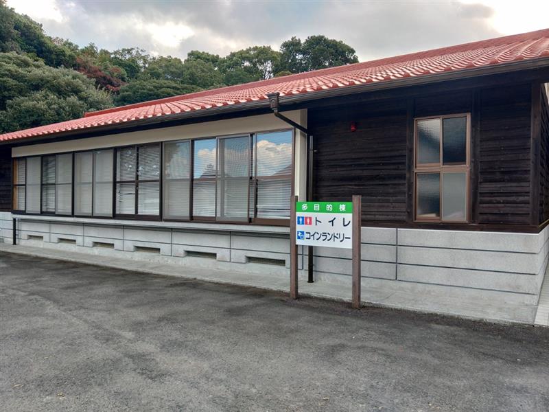 管理棟横にはトイレ(バリアフリートイレあり)・コインシャワー・コインランドリーがあります。
