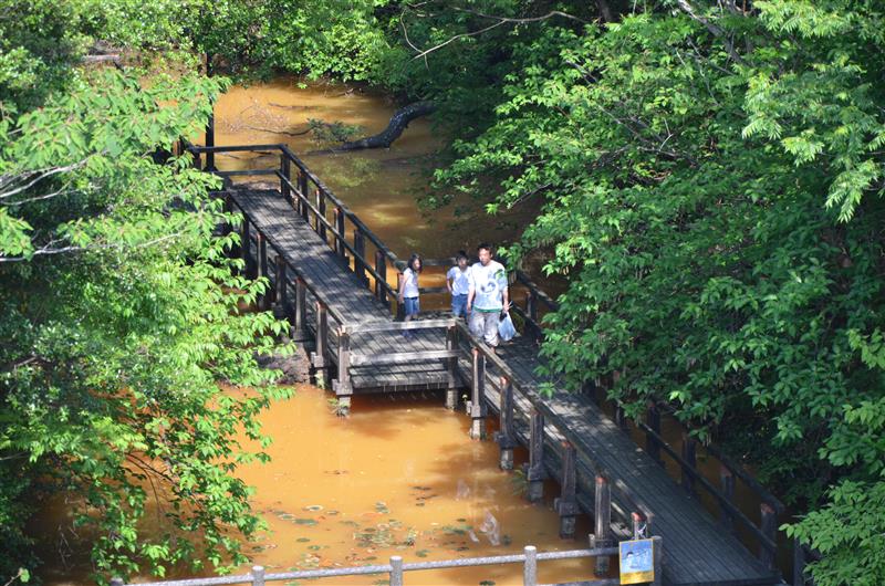 池の水はなんと鉄分を含んだ赤茶色。鯉も泳いでいます。